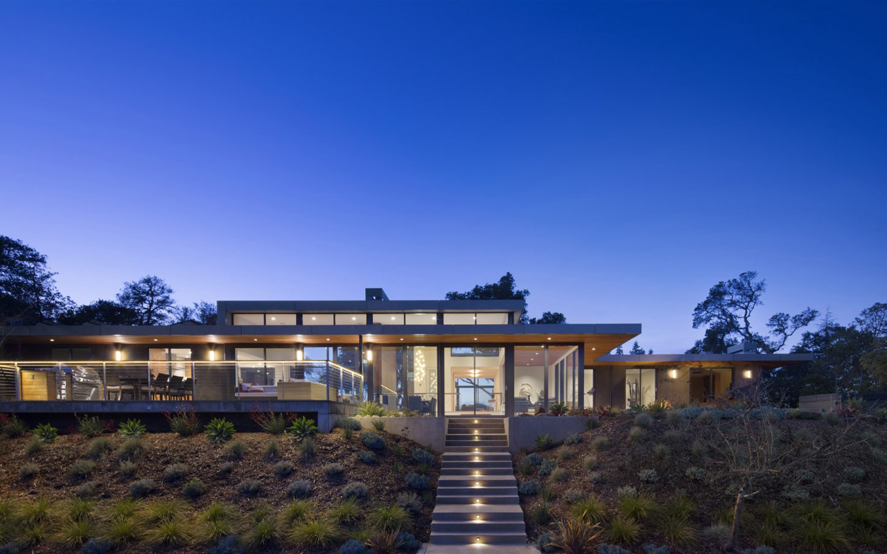 The remodeled home is roughly 4,700 square feet in size, with additional area added being only 462 square feet, but the effect of lifting the roof three feet higher and opening the house views up are dramatic. The house reflects the owners’ interests and lifestyle which involves sports and entertaining. The existing family room became a game room for billiards and football-watching, and the entry forecourt has a basketball stand then off to the side is a Bocce ball court. A large swimming pool sits down below the main house.