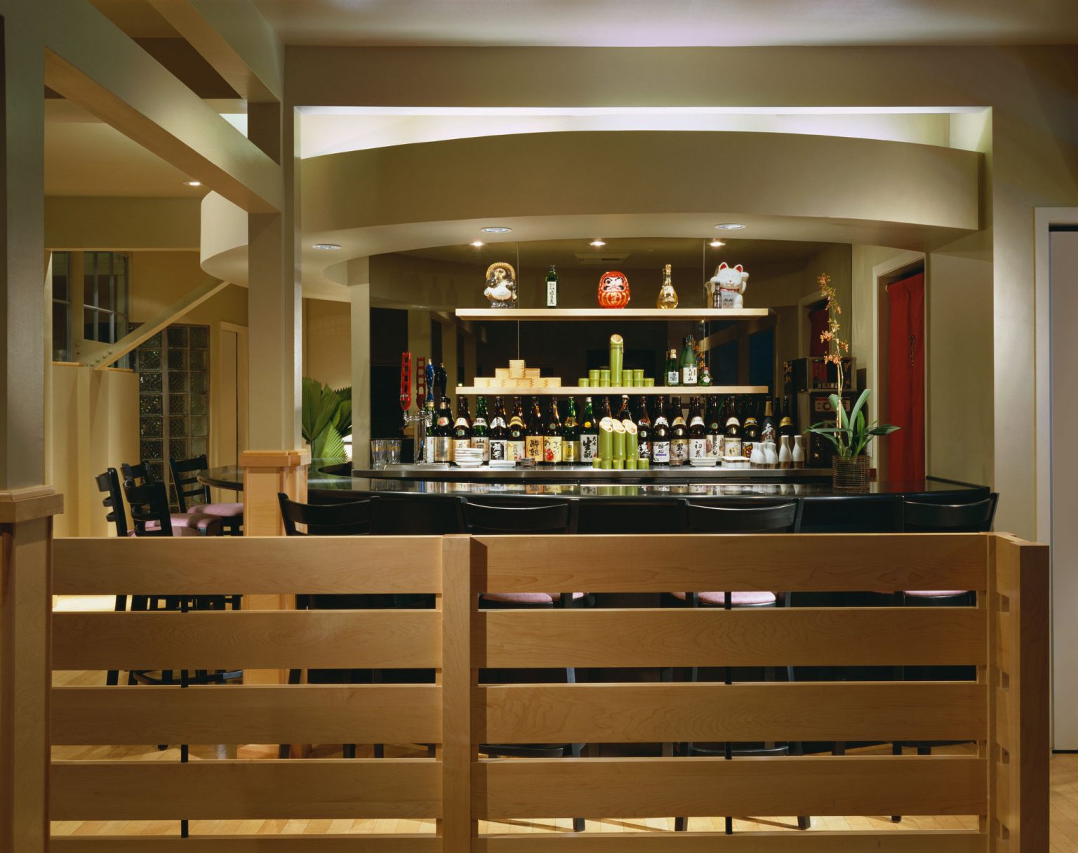 The project was to remodel the existing, already very successful restaurant in Berkeley. New colors and materials were introduced and low fences were designed to clarify circulation from seating areas. A new sake tasting bar was added as a circular element that pivots circulation behind from a waiting area and the restrooms. Extensive neighborhood meetings were held on Sundays to ensure participation to solicit opinions to control restaurant parking in adjacent residential neighborhoods.