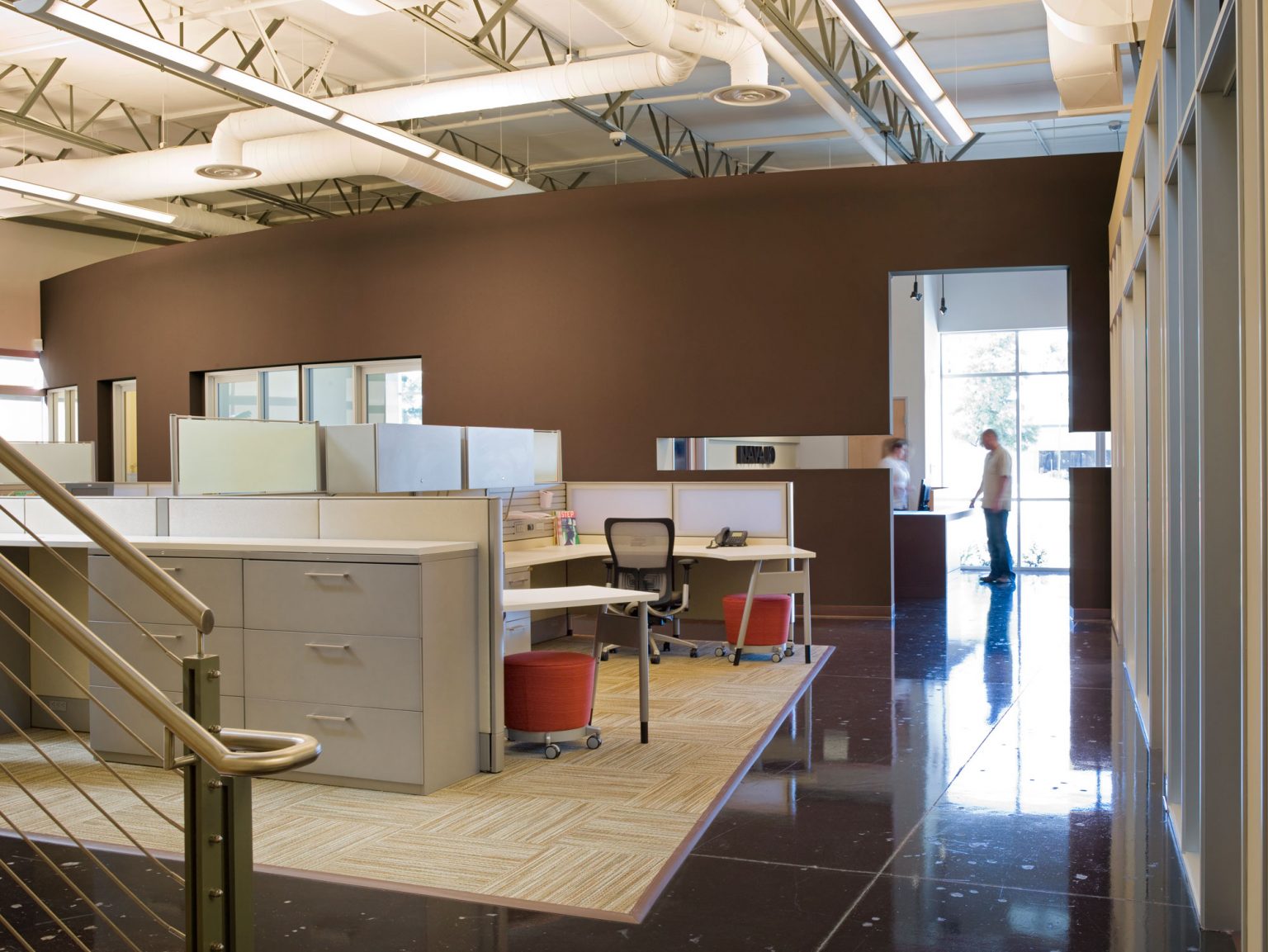 The open office environment sits on an island of neutral-toned carpet tiles laid in a crisscross pattern, while the circulation areas are of highly polished concrete floors. Bright red stools dot the landscape. The mezzanine stair landing sits perched on a single column planted in the concrete floor. Navajo’s theme is reflected in the warm colors balanced by the cool tones of Haworth’s open office systems, which have translucent upper panels for privacy and openness. Both task chairs and conferences chairs have open weave back supports. From the main conference room, big doors and windows give generous views to the office interior. Brightly colored stools brighten up the break area, which has a roll-up garage door to let the outside in on sunny days..